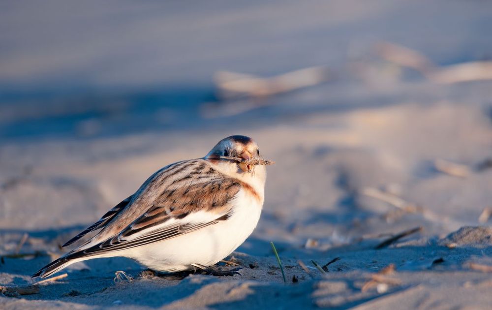 Een mannelijke sneeuwgors was samen met een vrouwtje op zoek naar iets lekkers. Driftig struinend door het zand kwamen ze wat lekkers tegen.