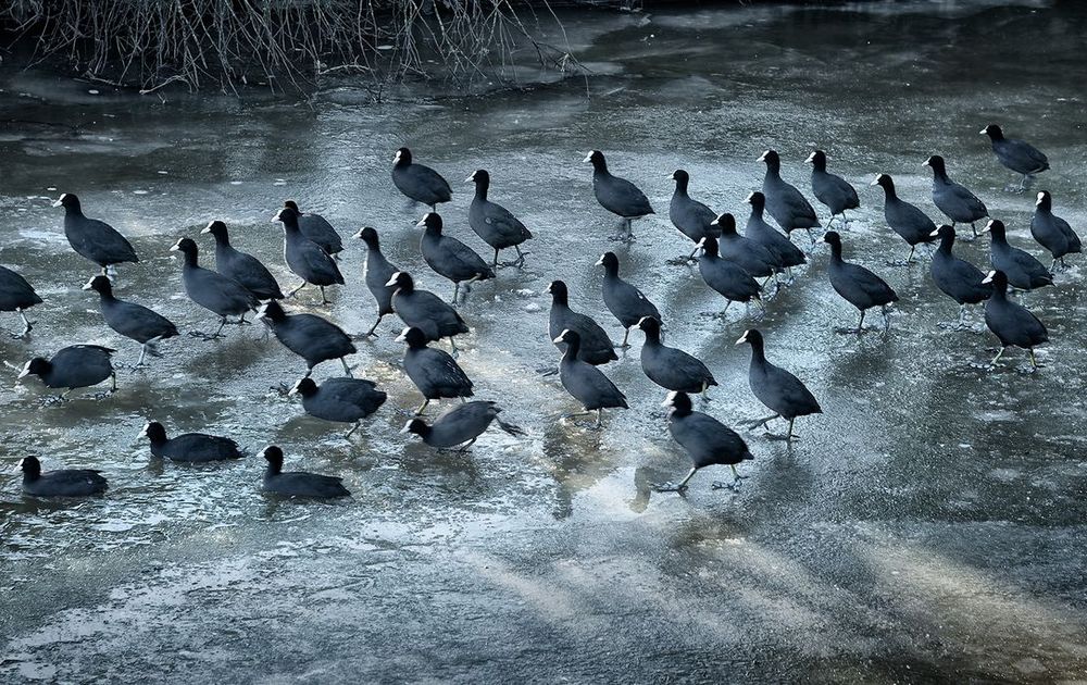 In de winter zie je veelal grote groepen meerkoeten. Hier verzamelen ze zich rondom een wak in het ijs en omdat ze allemaal dezelfde kant op lopen geeft dat een mooi effect.