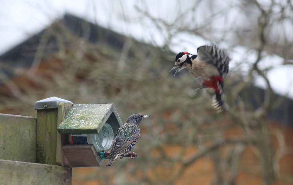 Het is winter en koud. Moeilijk voor de vogels om eten te vinden. Het voederpotje biedt uitkomst. De specht probeert de spreeuw weg te jagen. Om het voederpotje op te eisen.