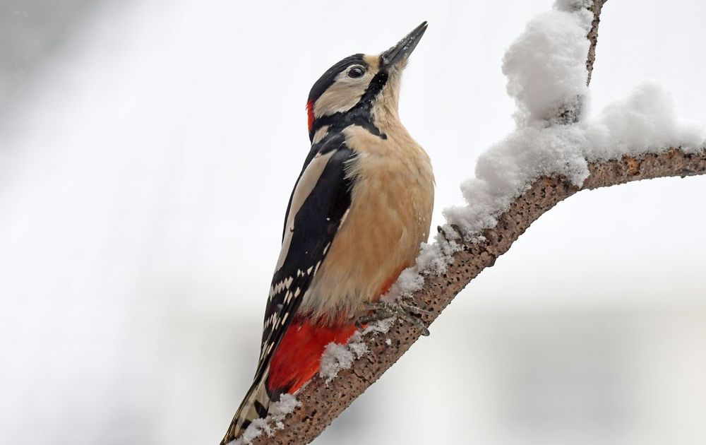 Een aan de balkonrand bevestigde tak en een pot vogelpindakaas aan de muur weten deze man grote bonte specht te lokken.