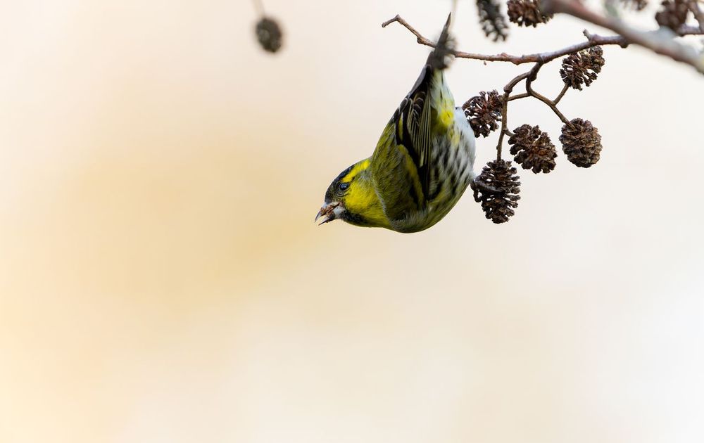 In de botanische tuinen van de Universiteit Utrecht foerageren regelmatig verschillende vinkensoorten op de elzen. Deze sijs zat mooi op ooghoogte met een wilg op de achtergrond die bijna goud oplichtte in het zonlicht.