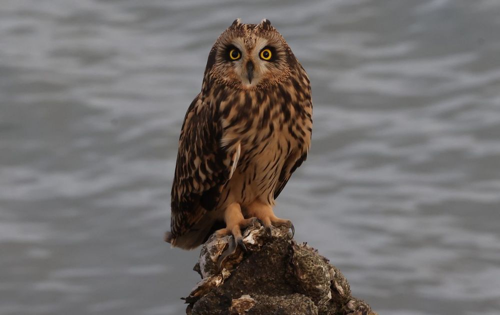 deze velduil warmt zich op in de zonnestralen op een koude winterdag