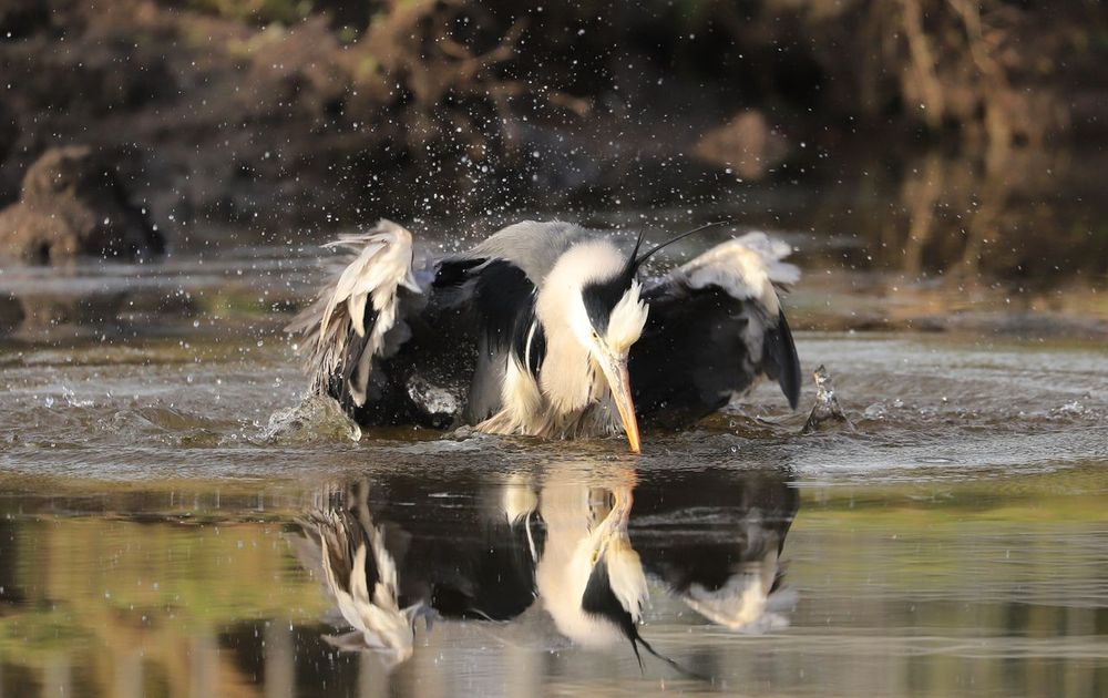 Reiger heeft tot drie keer toe geprobeerd om vis te vangen hetgeen niet lukte, daarna werden de veren even losgeschud….