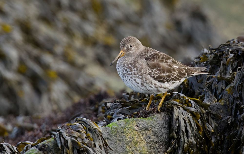 Er zat een grote groep Paarse Strandlopers op de strekdam. Deze liepen in de luwte van het muurtje te foerageren. Deze zat net even lang genoeg boven op een blok, voor ook hij afdaalde naar de rest van de groep.