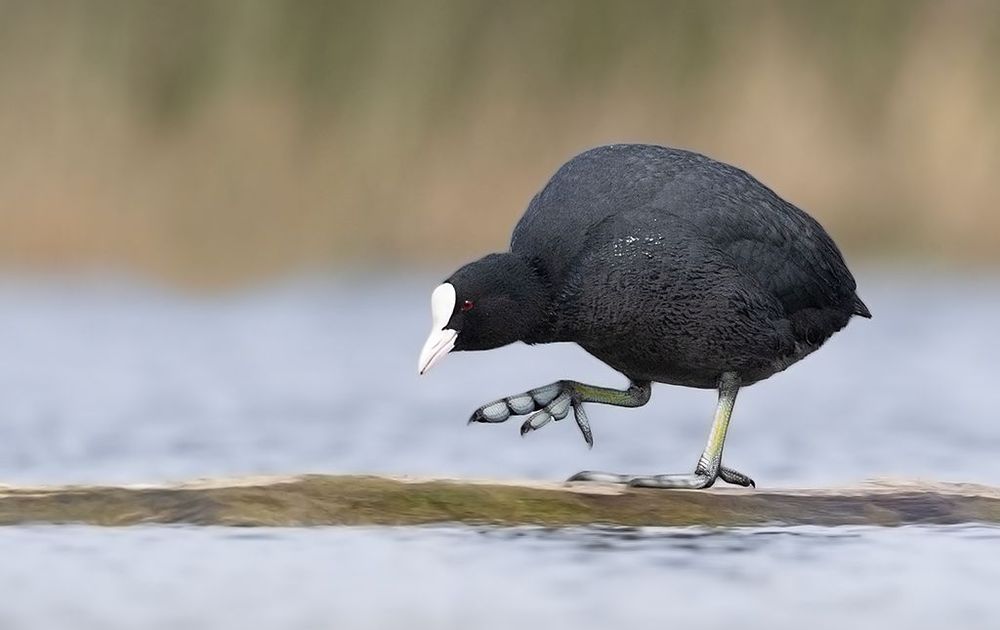 De Meerkoet stapte parmantig met zijn grote voeten over de boomstam die in het water lag.