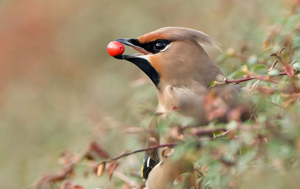 Wat een mooi moment was het wanneer deze prachtige pestvogel dichtbij kwam zitten om te eten. Het besje in de snavel maakte de foto af.