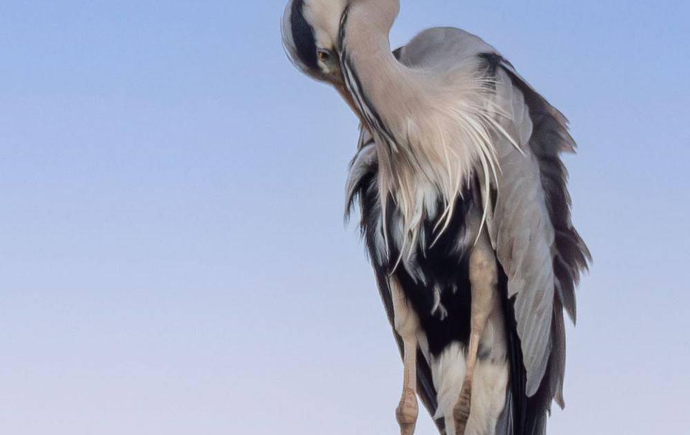 Deze blauwe reiger zat op een zonnige ochtend op het dak. Zij veren zaten wat wild door de stevige wind.