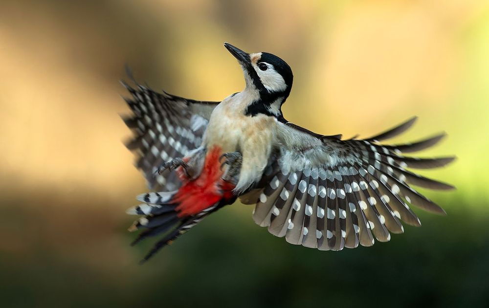 Een Grote Bonte Specht spreidt haar vleugels en laat zo de prachtige tekening hiervan zien.