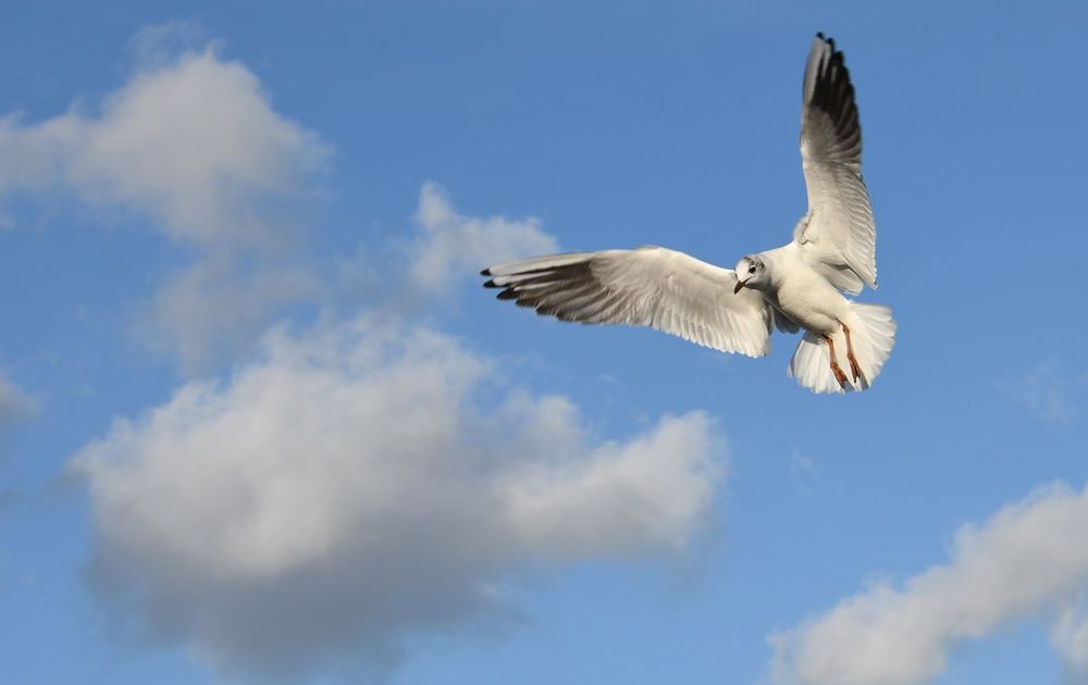De kokmeeuw heeft al vliegend ongetwijfeld iets op de grond gezien wat voor hem interessant is.