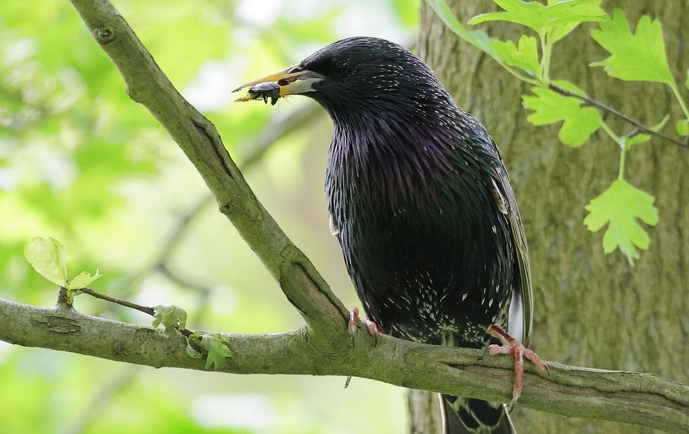 Deze spreeuw heeft een kever gevangen, die ze aan haar jongen gaat voeren.