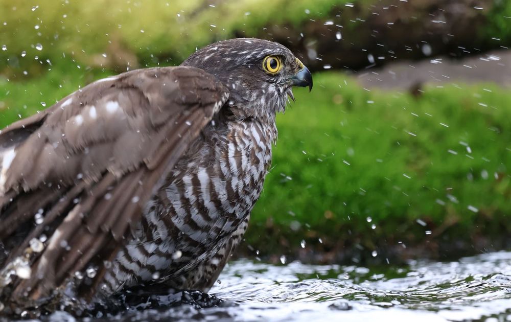 Gemaakt in een fotohut. Deze sperwer kwam net voor vertrek nog even badderen