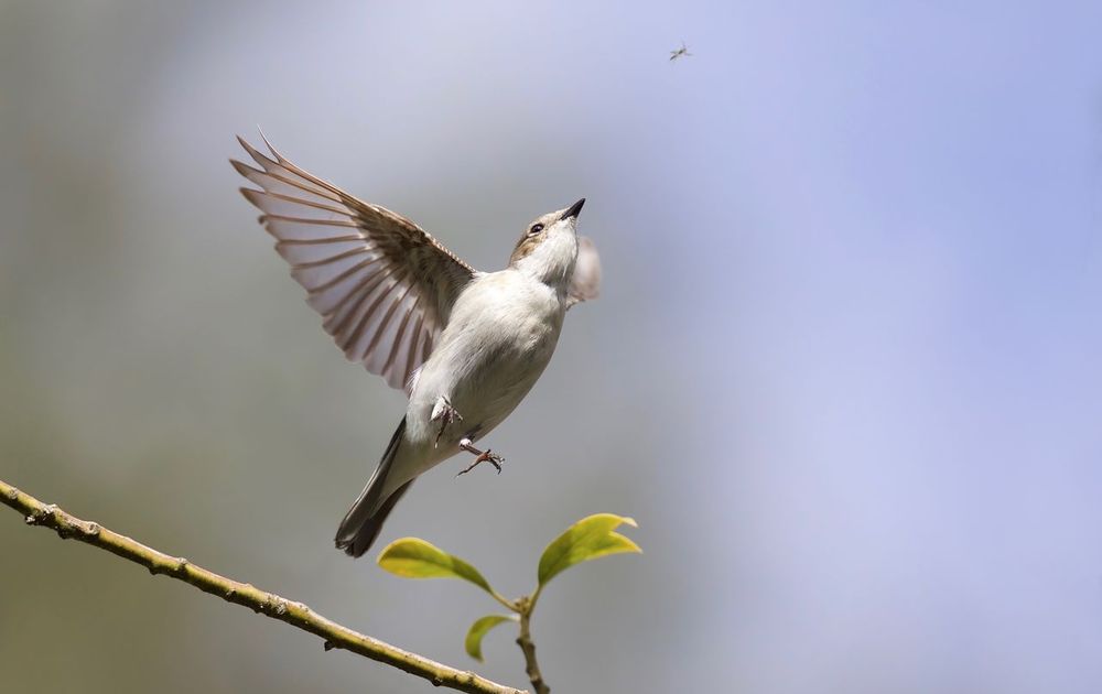 Soms moet je geluk hebben: ik had foto's gemaakt toen deze bonte vliegenvanger op een takje zat. Nu zie ik pas dat daar een vliegend beeld bij zit (op weg naar een lekker hapje).