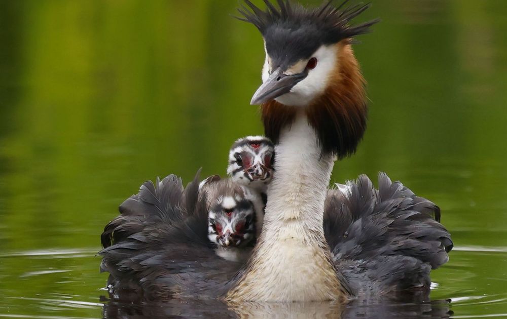 Thuis in de sloot wacht de Fuut met de twee kleintjes af wat zijn partner aan eten opduikt. Jaarlijkse onvergetelijke taferelen van deze mooi gekleurde vogels.