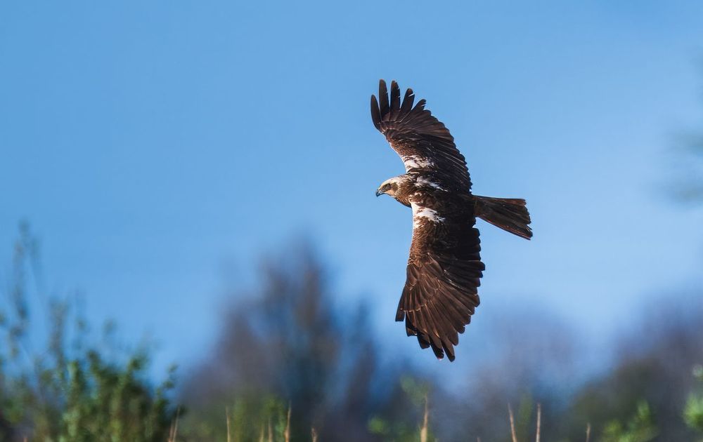 Bruine kiekendief vrouw heeft een tijdlang in het weiland gezeten. Ik wilde eigenlijk al vertrekken toen ze besloot om ook de lucht in te gaan en zich bij man kiekendief te voegen.