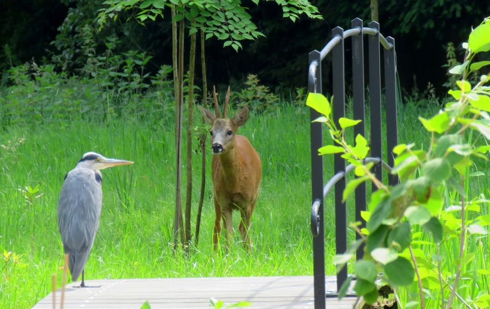 Blauwe Reiger bewaakt zijn territorium en blijft zitten totdat het bokje wegliep, achteruit kijkend naar de Reiger, bijzonder moment
