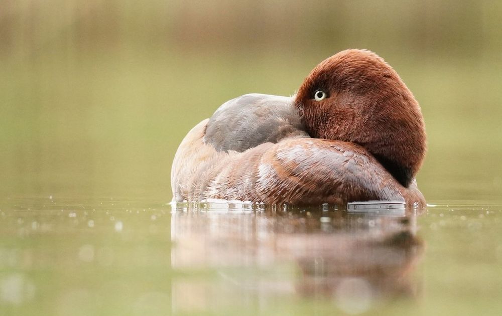 Ineens dobberde deze zeldzame eend in de vijver van het parkje waar ik vaak wandel. Toen hij langs een opening in het groen dreef, kon ik deze foto maken. Hij had mij ook al gezien, zag ik achteraf.