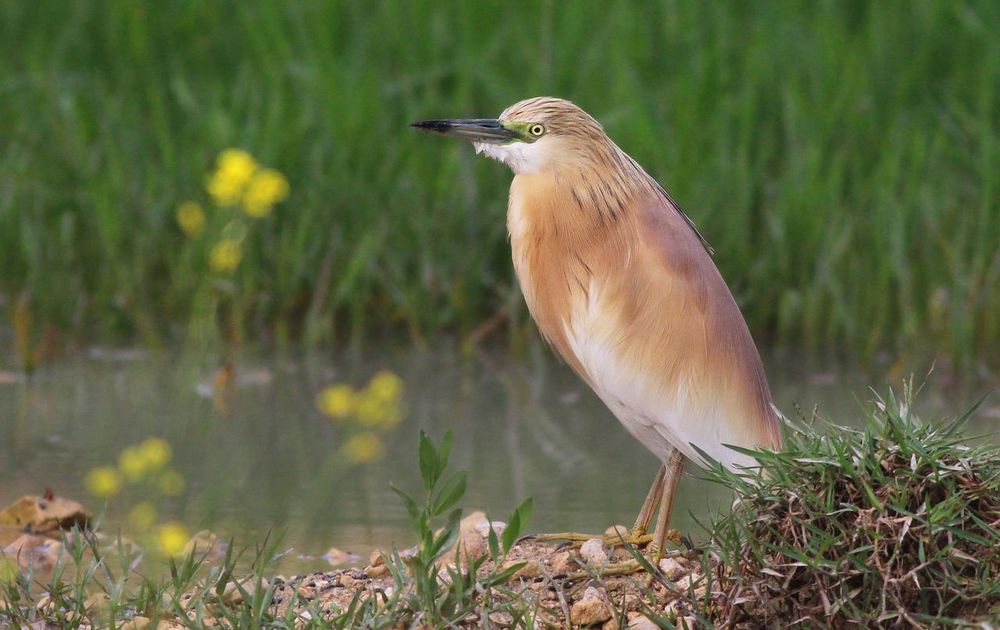 Squacco Heron resting in a rural passage to close to a water puddle during spring migration