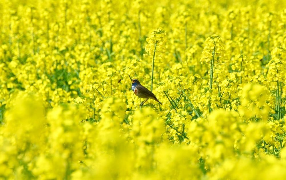 vanwege het mooie kleurcontrast was ik op zoek naar een blauwborst in dit koolzaad veld in volle bloei, na enkele keren terug gekomen te zijn lukte het uiteindelijk ook, de aanhouder wint....