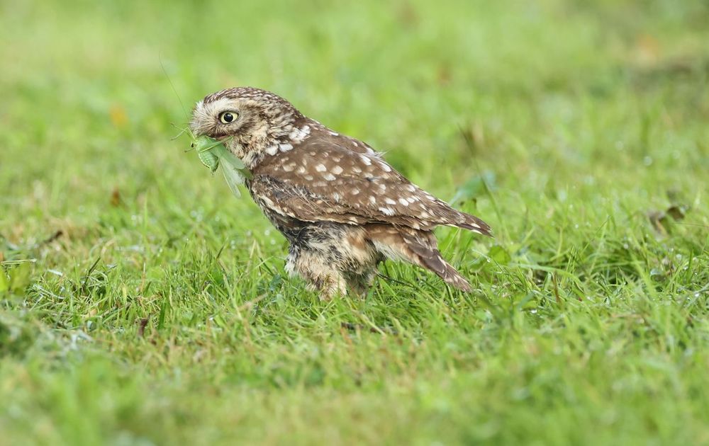 steenuil vangt een sappige sabelsprinkhaan en voert deze aan zijn jongen