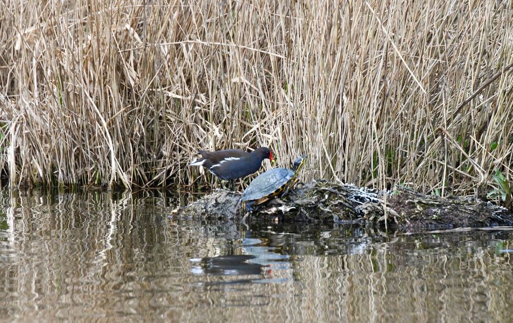 exotische geelbuikschildpad mooie combinatie met de nieuwsgierige waterhoen