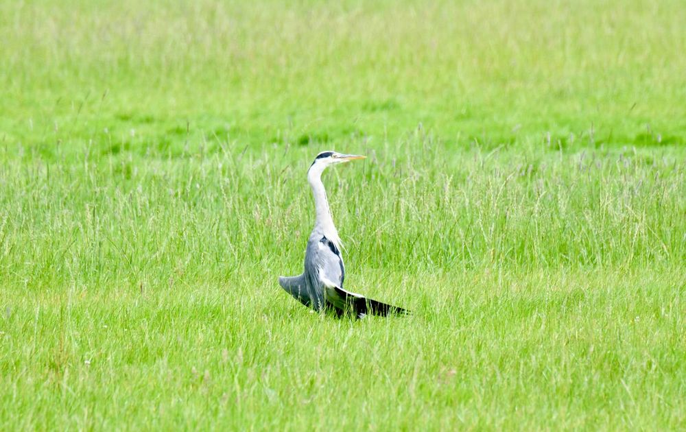 deze blauwe reiger zat minutenlang in deze houding in het weiland, leek net op een yoga houding