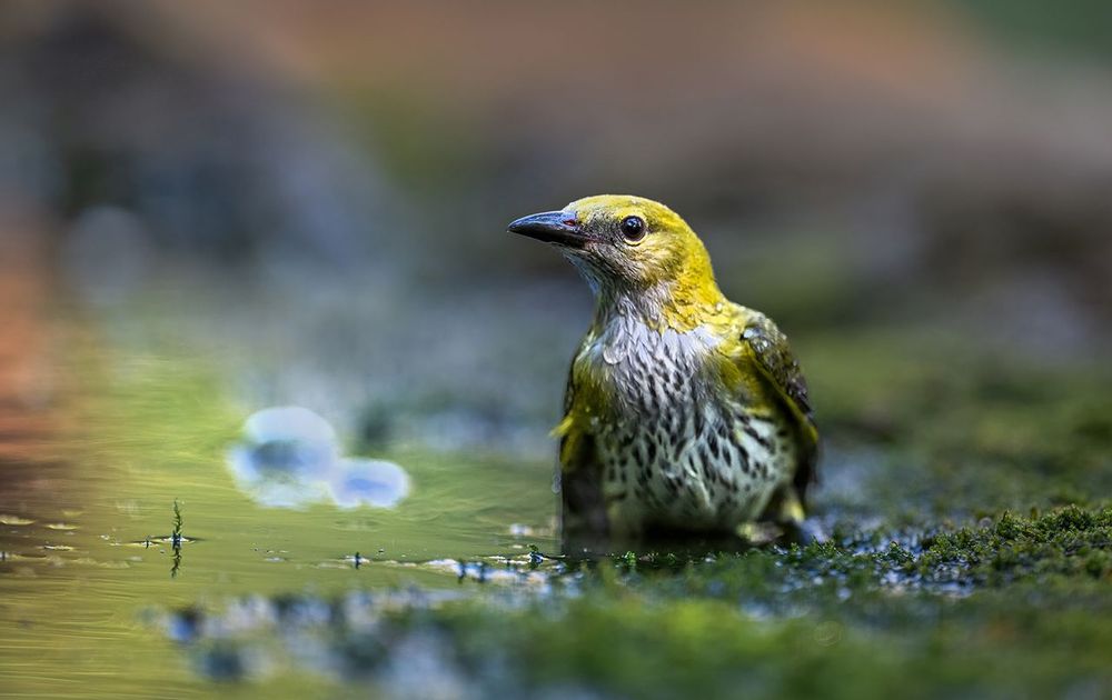 Gefotografeerd vanuit een vogelhut in een bos. Al een poosje was het kenmerkende dudeljo te horen, voordat zij zich liet zien. De wielewaal is een schuwe vogel, maar door de hitte wilde ze toch wel even het water in.
