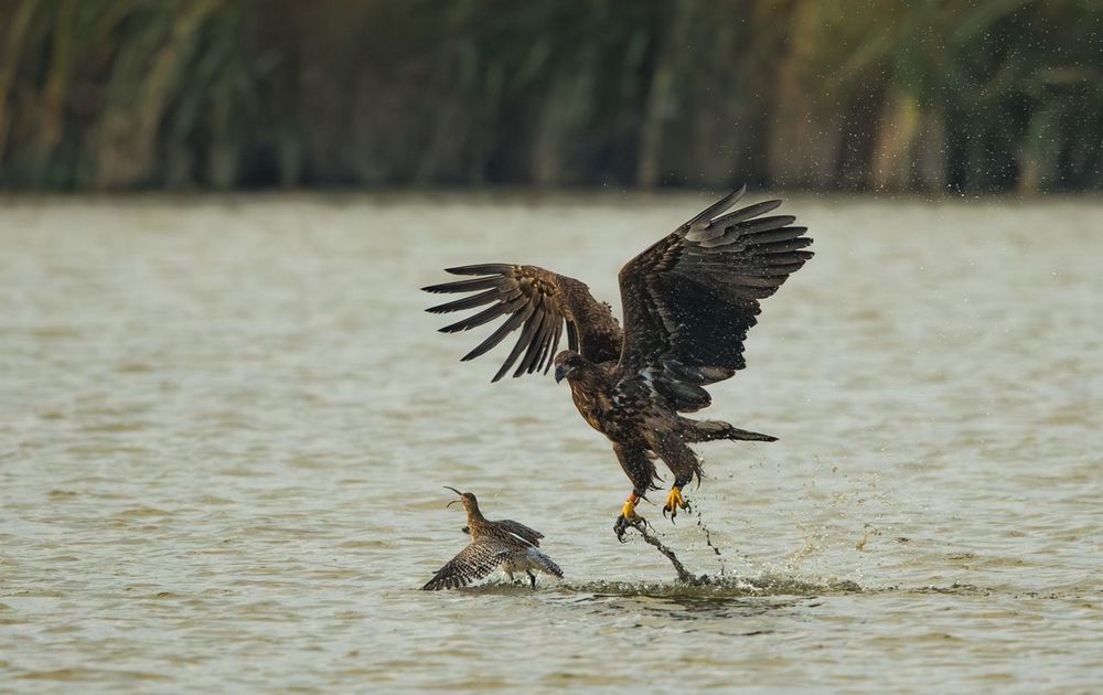 Indenk dat de Wulp niet helemaal gezond washi zat tussen een groep Wulpen en Kieviten.Bij het zien van de Zeearend vlogen die de lucht inde Wulp bleef achter en was de klos.