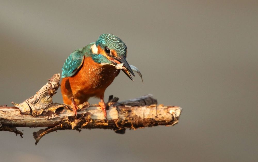 De ijsvogel vangt wel dertig visjes per dag. Slaat het visje dood en slikt het in zn geheel door.