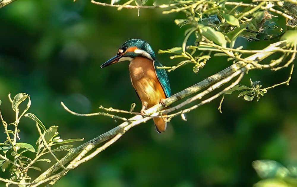 Het ijsvogeltje zit te genieten van de avondzon.