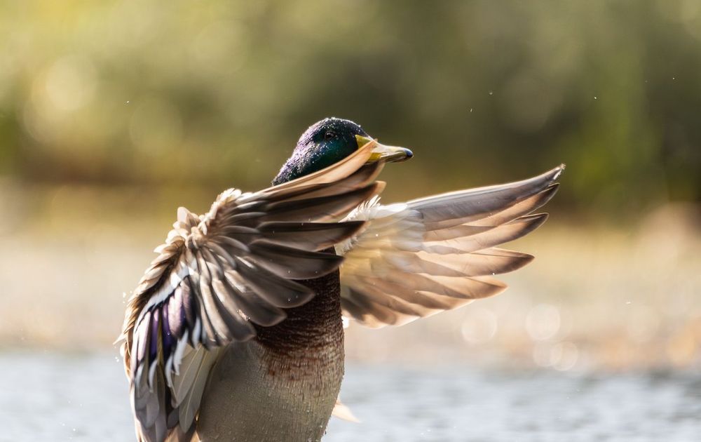Mijn idee was om foto's te maken van de wilde eenden als ze hun vleugels uitsloegen. Dit resulteerde in een hele lange tijd wachten, maar uiteindelijk had ik beet! Dit mannetje besloot zelfs om heel dichtbij te komen om vervolgens met zijn vleugels te slaan. Tijdens dat ik mijn sluiterknop ingedrukt hield bad ik voor in ieder geval 1 scherpe foto. Gelukkig zaten er meer dan 1 scherpe foto tussen, maar deze vind ik door de blik van de eend over zijn vleugel het leukst. Wat een ervaring!