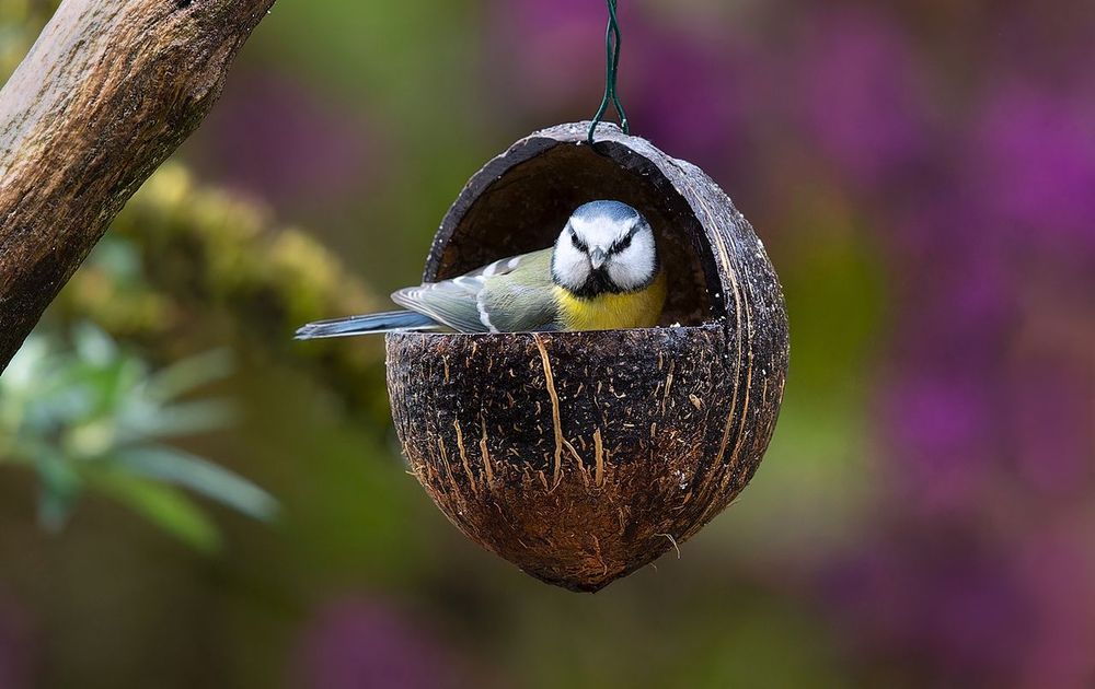 Een pimpelmees voelt zich blijkbaar thuis in een gevulde kokosnoot met op de achtergrond de paarse kleuren van de herfst