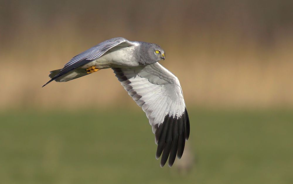 Een blauwe kiekendief man mooi voorbij vliegend in een laagstaand zonnetje.
