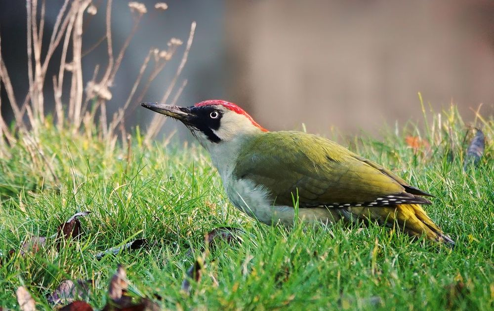 Meestal zie je alleen een groene schicht langsvliegen, maar dit keer bleef de groene specht even zitten.
