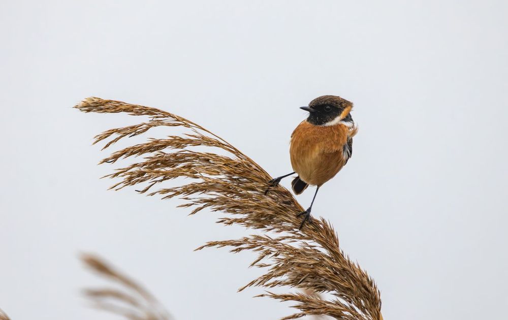 Op een mistige dag in de polder waren de vogels op het water bijna niet waarneembaar. Maar deze roodborsttapuit zat op een rietstengel. Het lichte windje blies zacht in zijn veertjes.