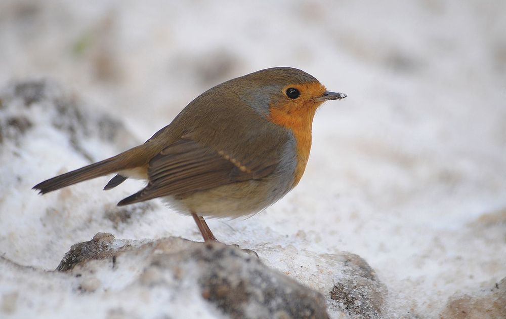 Een jaren oude foto. Bijna een historische foto, uit de tijd dat er nog wel eens sneeuw viel. De roodborst staat op de bevroren grond in Natuurpark Berg en Bos.