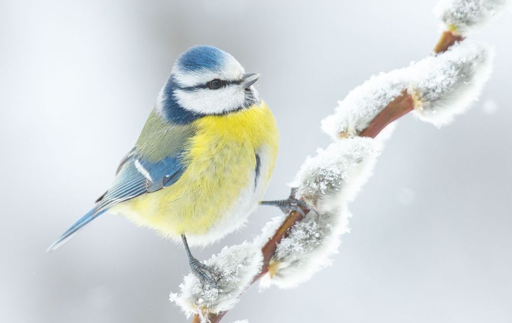 De katjes lopen al uit. En het sneeuwt. Mooie combinatie. en als het pimpelmeesje ook nog op de goede plek gaat zitten ben ik helemaal blij.