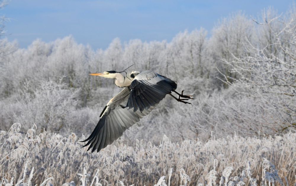onze blauwe reiger in de vlucht op een winterse ochtend vol met rijp