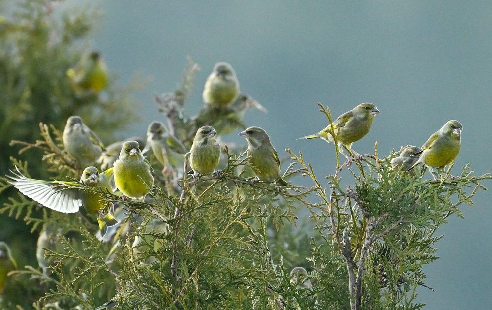 Een groep van wel 50 groenlingen vloog af en aan bij een boomkweker, midden in het land bij Garminge. (Dr.)