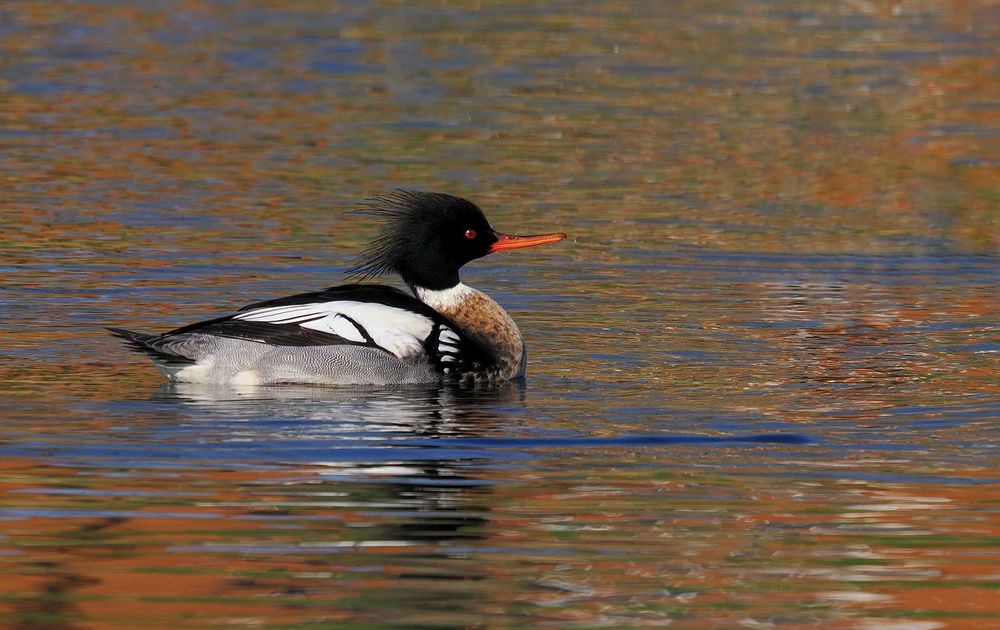 Dit mannetje van de middelste zaagbek trof ik zwemmend aan in een zoetwaterplasje midden in Zeewolde. Erg vreemd want deze soort overwintert meestal aan de kust in zout water. Na een half uur vloog de vogel weg. Het gekleurde water komt door de reflectie van omringende huizen