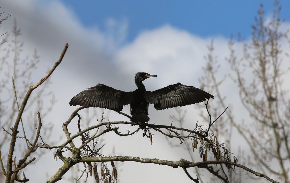 Hoog in een boom zit een aalscholver. Kijkt om zich heen en spreidt zijn vleugels. Zo blijft hij tijd zitten. Het lijkt of hij indruk wil maken. En duidelijk wil maken dat dit zijn gebied is.