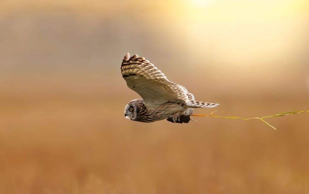 Velduil met tegenlicht van ondergaande zon, wist een rat te pakken en kwam voorbij vliegen met nog een stengel gras als extra...