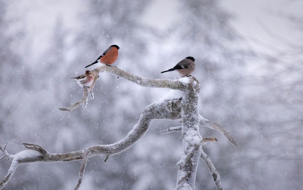 In de bomen zaten meerdere groepen goudvinken. Om en om kwamen de groepen naar de voederplaats.