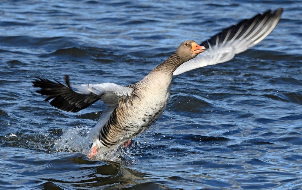 Op een grote waterpartij bij een bedrijventerrein landt een grauwe gans.