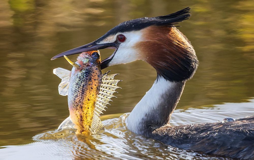 Een Fuut heeft een pos te pakken en die wordt na enige pijn en moeite volledig doorgeslikt.