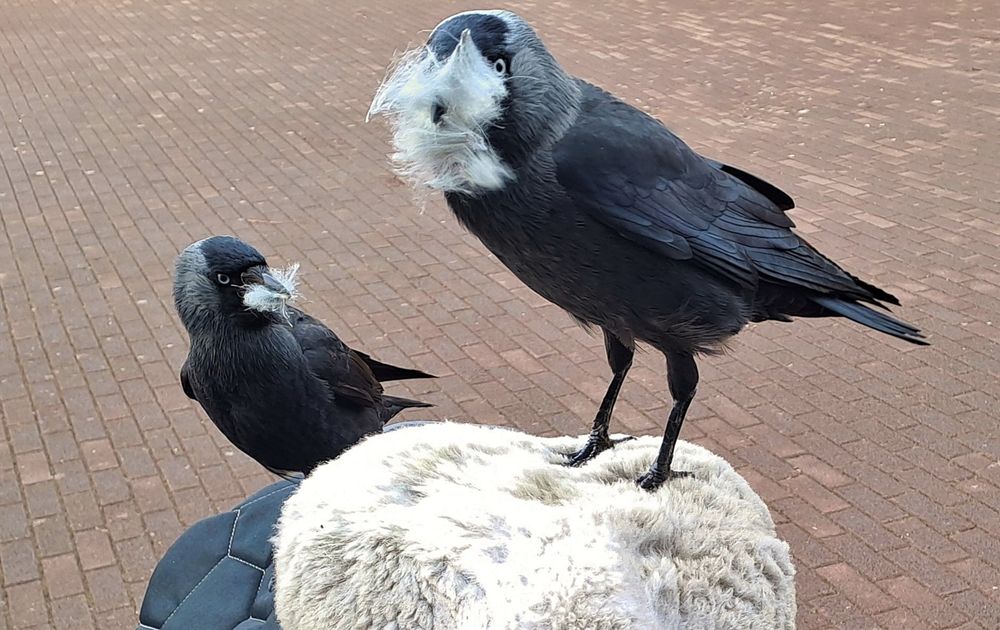 Dit maak ik elk jaar in het voorjaar mee. Deze keer vond ik 't toch best bijzonder... Toen ik het slot aan het voorwiel van m'n fiets vastmaakte en opkeek, waren er twee kauwtjes bezig wol van m'n zadeldekje te plukken. We waren amper een halve meter van elkaar verwijderd. Ook toen ik voorzichtig m'n camera pakte, om 'n foto te maken, gingen ze gewoon verder.