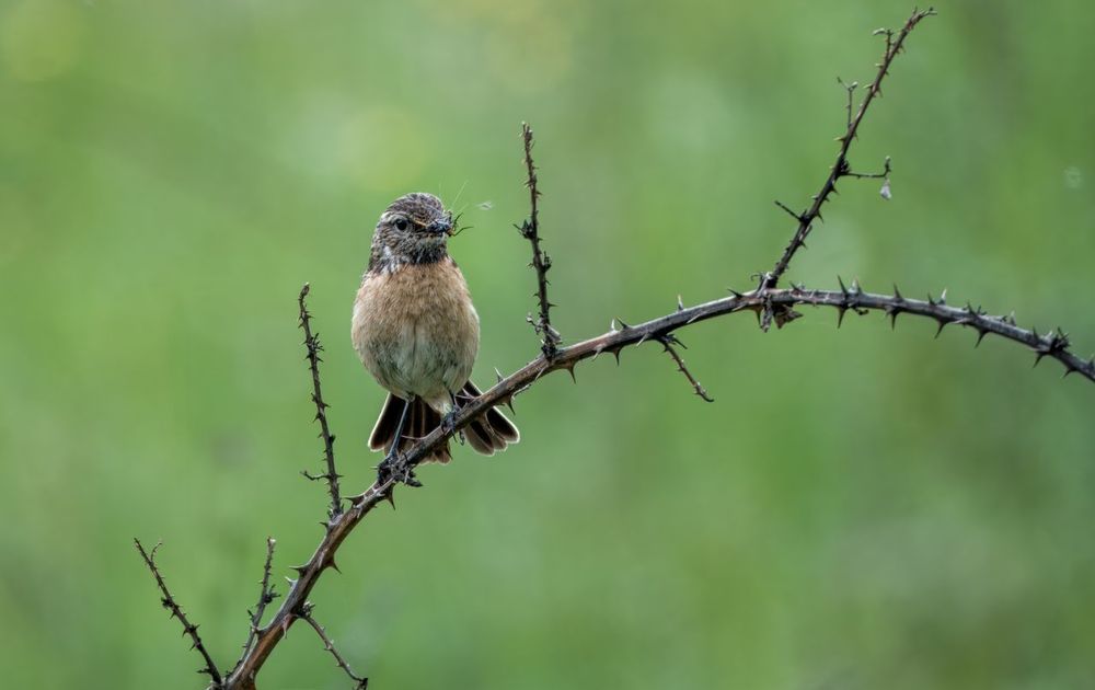 Roodborsttapuiten hebben we in Extremadura veel gezien. Dit vrouwtje ging met een volle snavel op een sierlijk takje zitten. Waarschijnlijk op weg naar haar nest met jongen. Extremadura, 16 april 2025