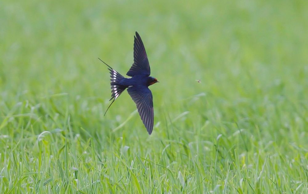 Met een zware prime lens ben je een stuk minder wendbaar dan met de lichtere zoomlens. Bovendien kan je natuurlijk niet even uitzomen om de snelle zwaluw te vinden. Tevens kan de R body heel snel vliegende vogels niet herkennen als ze dichtbij zijn. Kortom, ik dacht: het gaat lastig worden om een goede foto te maken van een vliegende boerenzwaluw. Echter, binnen 5 minuten had ik deze scherp op de plaat. Gezien bovengenoemde hobbeltjes heeft geluk hier zeker meegewerkt :-)
