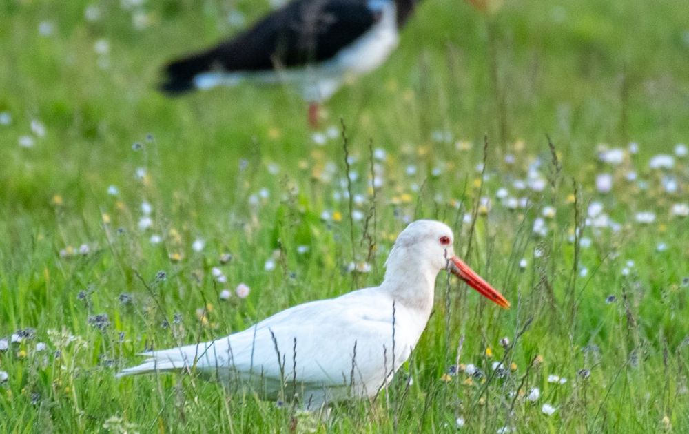 Witte scholekster met bonte piet op de achtergrond. Bijzonder wit exemplaar, geen zwart te bekennen bij deze vogel.