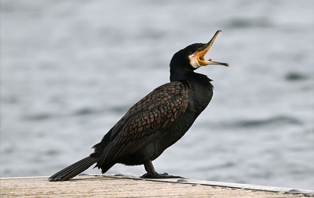 Mooi om de bek van de aalscholver zo wijd open te zien, inclusief de tong, die geen verdere functie blijkt te hebben.