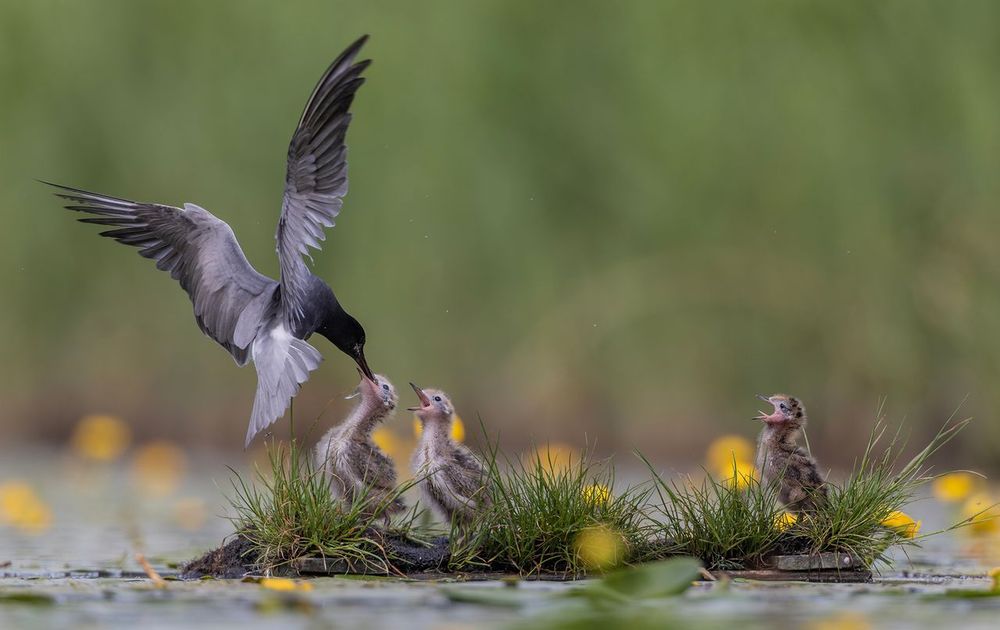 Het voeren van de jonge zwarte sternen is iedere keer weer geweldig om te zien. De ouders vliegen over het nest zonder te landen. Maar het voedsel wordt toch heel precies in een snavel gestopt, zoals je hier kunt zien. En dat alles in een fractie van een seconde!